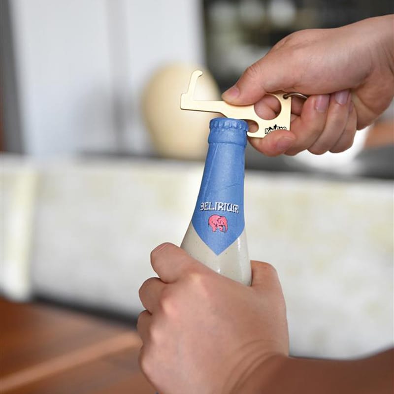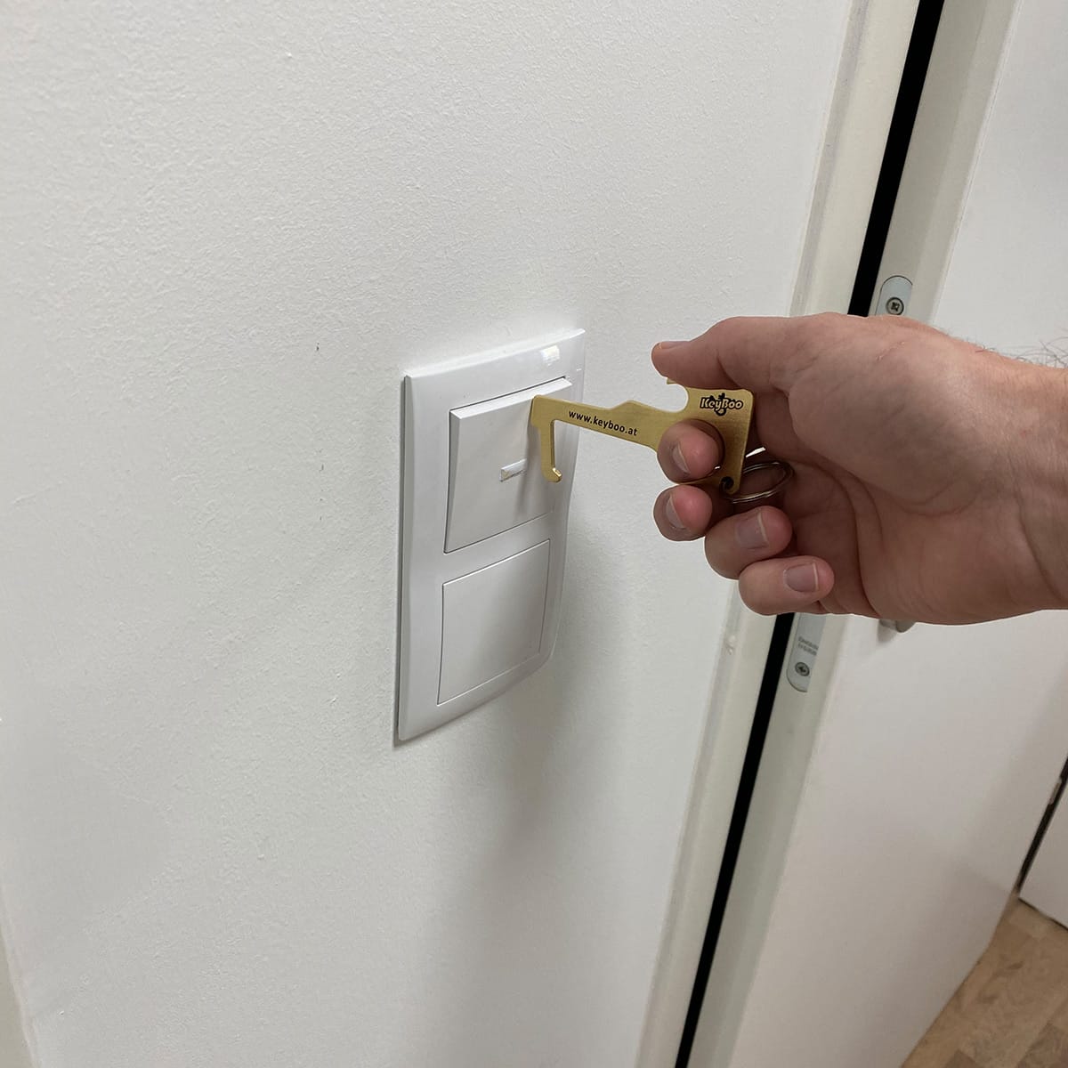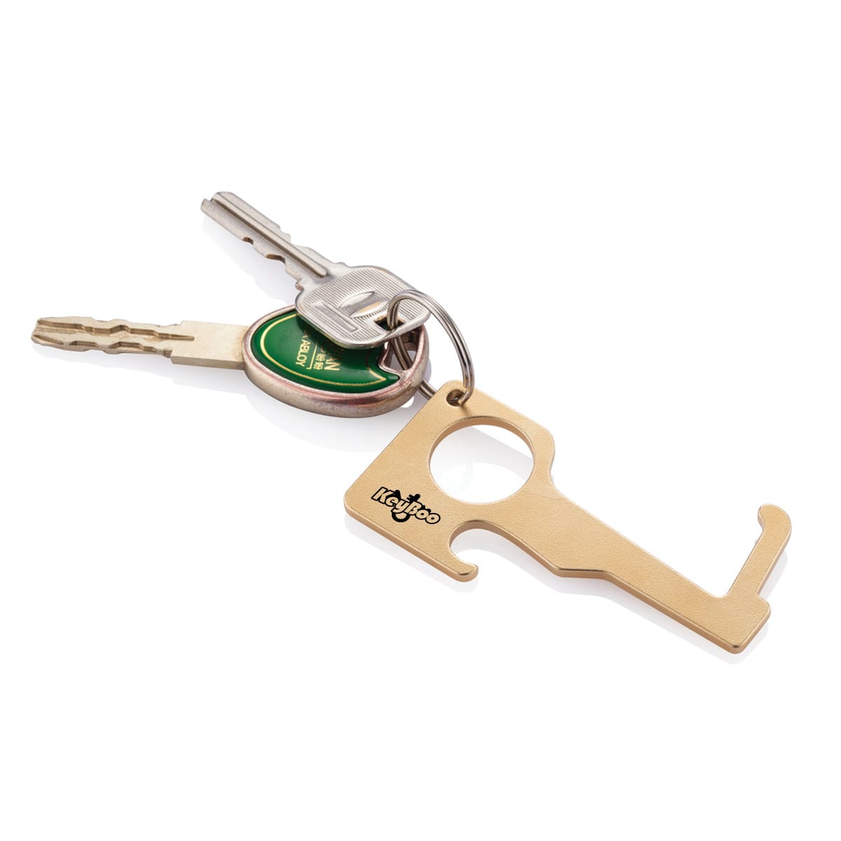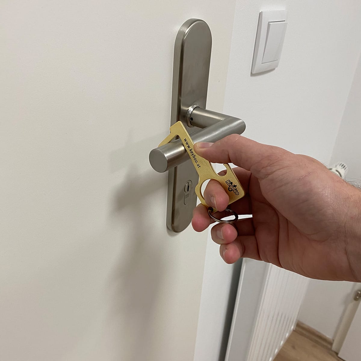 Dieser Zero-Contact Schlüsselanhänger aus Messing ( 62% Kupfer % 38% Zink) hilft Ihnen dabei weniger Oberflächen zu berühren. Wie z.B. Türklinken, Aufzugsknöpfe, Geldautomaten oder die Tasten von Kartenzahlgeräten. Denn Kupfer hat eine antimikrobielle Oberfläche auf der 99% aller Bakterien nicht überleben können. Haben Sie also diesen Schlüsselanhänger immer dabei und Sie könenn sich sicher sein, dass Sie nur noch so wenig Oberflächen wie wirklich nötig berühren.