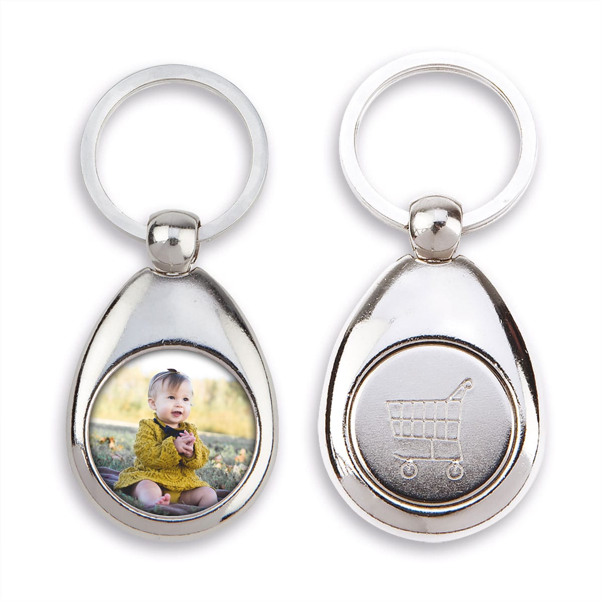 Diesen Schlüsselanhänger mit Einkaufswagenchip kannst du mit deinem Foto oder Logo individuell gestalten.